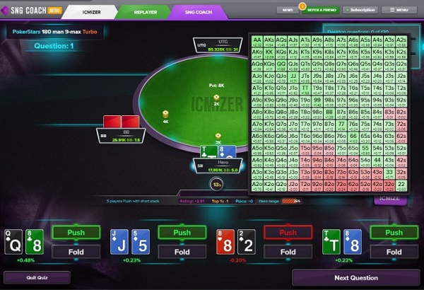 Мобильная версия представлена только отдельным платным модулем под названием ICMIZER SNG Coach, что может создавать неудобства для игроков, предпочитающих работать над игрой с использованием смартфона или планшета. Тем не менее, оценивая общую ценность программы, она в любом случае стоит внимания каждого турнирного игрока любого уровня подготовки.