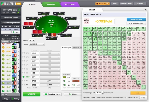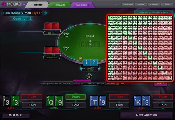 ICMIZER 3 представляет собой софт, разработанный специально для любителей турнирного формата и поклонников Sit and Go. Программа работает на базе сложной математической модели Independent Chip Model, которая позволяет определять наиболее выгодные стратегические решения в ключевых моментах игры. Данное приложение становится незаменимым помощником при принятии решений в пуш/фолд ситуациях.