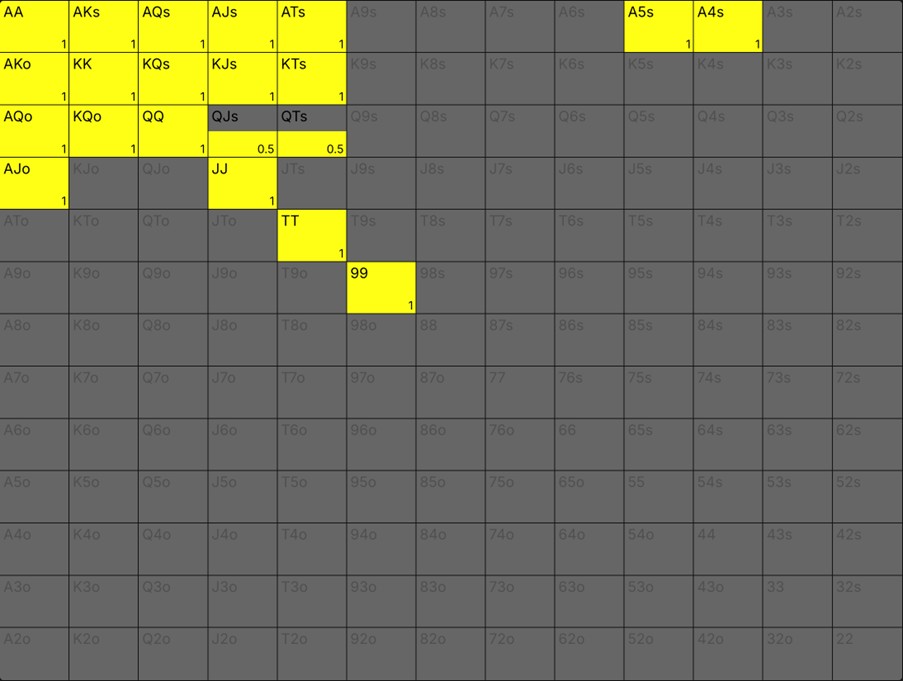 KQo и AJo, с точки зрения солвера, находятся на границе сквиза. При этом солвер иногда сквизит 66-88 и некоторые одномастные коннекторы.